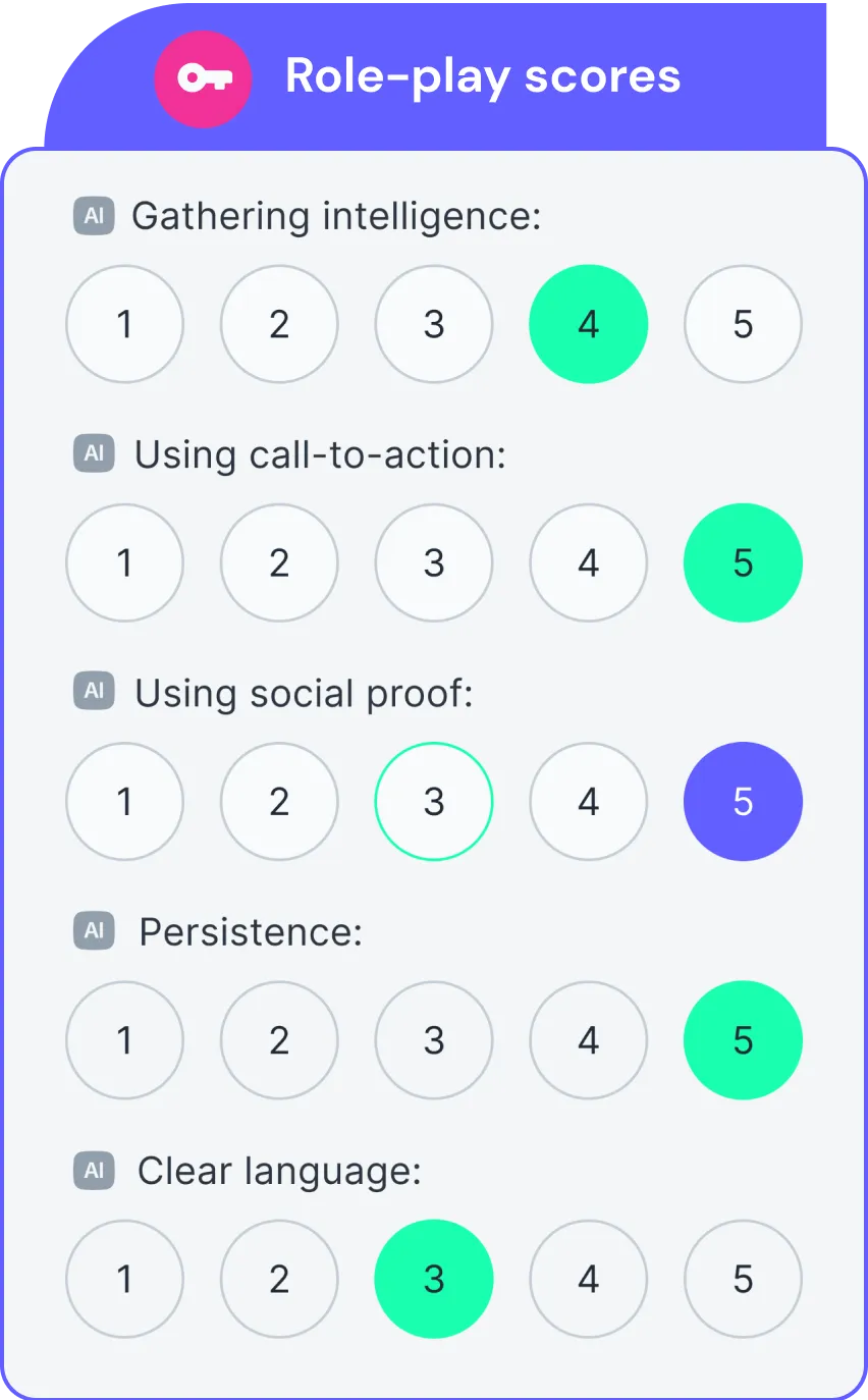 Turn every flipped call, meeting, or presentation into a valuable experience. Take advantage of intelligent AI and a professional sales coach to review and score your role plays