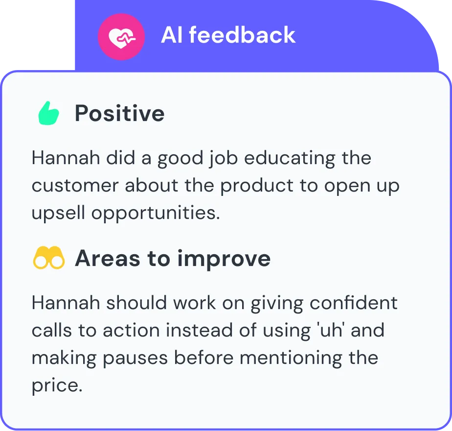 Turn every flipped call, meeting, or presentation into a valuable experience. Take advantage of intelligent AI and a professional sales coach to review and score your role plays